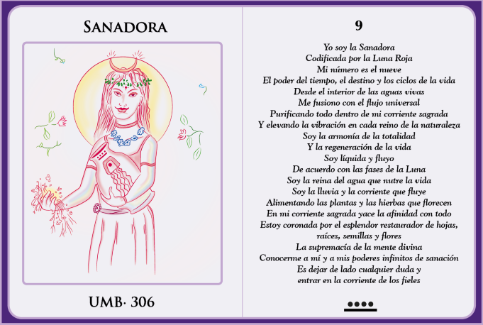 La Sanadora - Luna Roja - Poder de Purificación (poder Sanador del Agua Universal de compasión). La Purificación es la fuente y el poder sanador del amor. La Sanadora es aquella que crea la totalidad, quién sabe cómo fluir en la totalidad, quién sabe cómo reparar lo que se ha separado, y como enfriar el corazón discordante. La Sanadora es la unidad con el poder del Sueño. Es la Sanadora quién transmite su poder sanador de purificación al Compasivo como el Agua Universal del amor que todo lo sana. La Sanadora conoce los caminos de la Tierra, las plantas y los secretos de los animales. La Sanadora enseña que la auto-sanación es auto-amor, y que todos somos ya intrínsecamente la totalidad. (306)